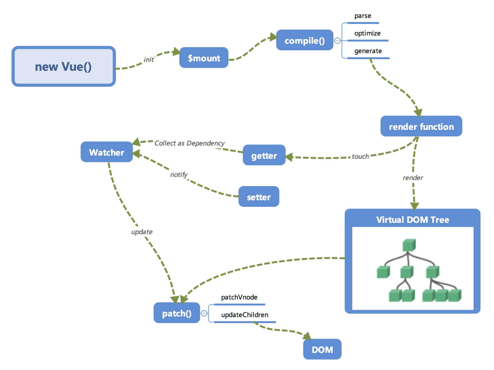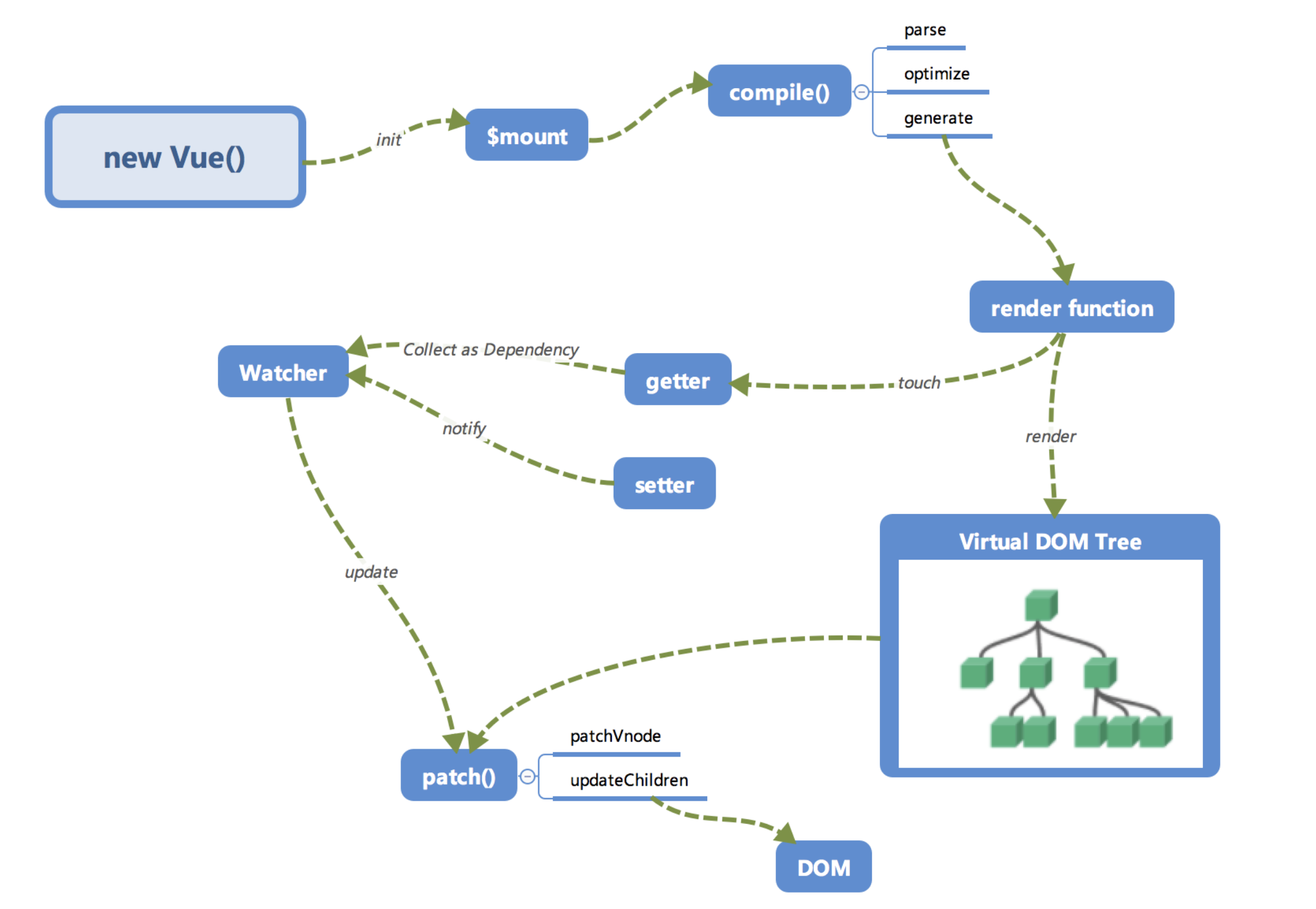 Vue.js 是采用数据劫持结合发布者-订阅者模式的方式,通过Object.defineProperty()来劫持各个属性的setter,getter,在数据变动时发布消息给订阅者,触发相应的监听回调。主要分为以下几个步骤: