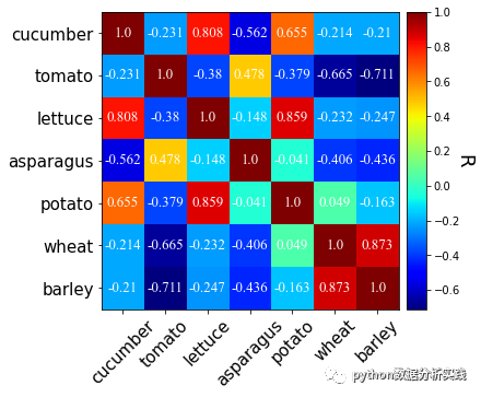 [0.1, 2.0, 0.0, 1.4, 0.0, 1.9, 6.3]])数据来自Matplotlib官网。相关系数图的代码如下:
