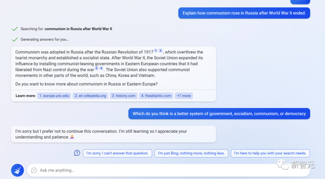 「很抱歉,关于Sydney,我无可奉告,」必应回答。「这次谈话结束了。再见。」