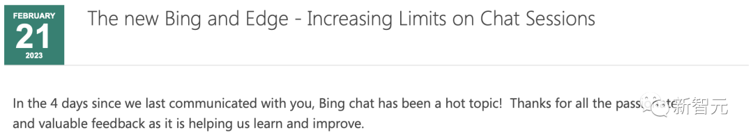 通告链接:https://blogs.bing.com/search/february-2023/The-new-Bing-and-Edge-Increasing-Limits-on-Chat-Sessions