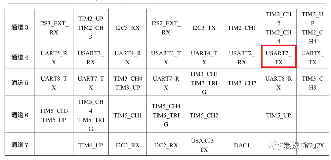 }这里为了方便直接使用了查询DMA状态寄存器,有需要可以修改为DMA中断方式,查Datasheet可以找到串口2使用DMA1 channel4的stream6: