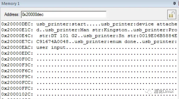 #endif在需要打印log的地方直接调用DEBUG()即可,最终效果如下,从Memory窗口可以看到打印的log: