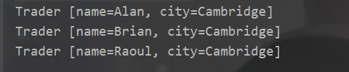 return "Trader [name=" + name + ", city=" + city + "]";