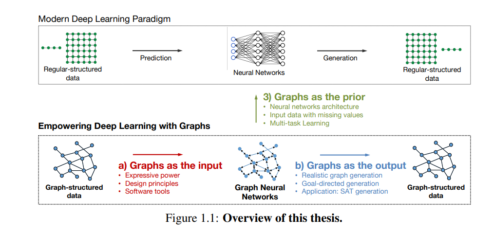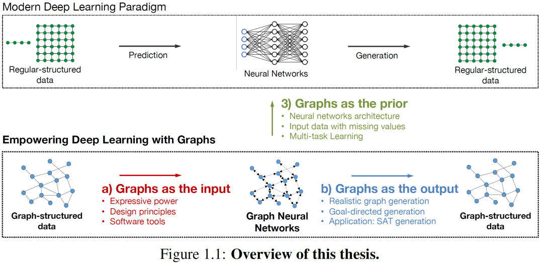 在本文中,我们的目标是用图结构数据增强深度学习。我们的愿景是为图形结构数据构建一个表达性强、使用方便的深度学习框架。我们希望这样一个框架可以将深度学习在规则结构化数据上的成功转化为图结构数据,图结构数据代表了更通用、更灵活的数据格式。同时,我们将展示一个成功的图的深度学习框架,进而推动深度学习研究的总体进展。为了实现这些目标,我们建议赋予深度学习框架以能力,使其能够将图作为输入、输出和先验。图1.1总结了三个研究方向。