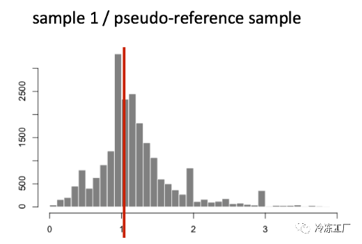 对于每个样本中的每个基因,计算比率(样本/参考)(如下所示)。由于大多数基因没有差异表达,因此每个样本中的大多数基因在样本中的比例应该相似。