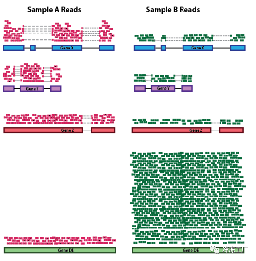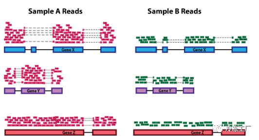 考虑测序深度对于比较样本之间的基因表达是必要的。在下面的示例中,每个基因在样本 A 中的表达似乎是样本 B 的两倍。然而,这是样本 A 的测序深度加倍的结果。