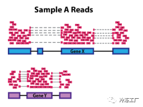 计算基因长度对于比较同一样本中不同基因之间的表达是必要的。在下面的示例中,基因 X 和基因 Y 具有相似的表达水平,但映射到基因 X 的读数数量将比映射到基因 Y 的读数多得多,因为基因 X 更长。
