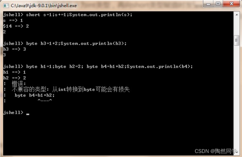 分析: s += 1 逻辑上看作是 s = s + 1 计算结果被提升为 int 类型,再向 short 类型赋值时发生错误,