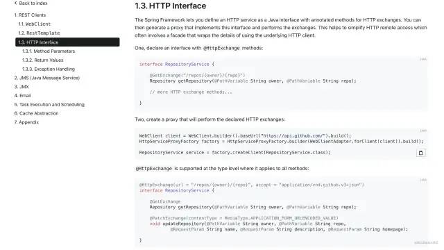 上文例子中的 GetExchange 注解代表这个方法代替执行一个 HTTP Get 请求,与此对应,Spring 还包含了其他类似的注解: