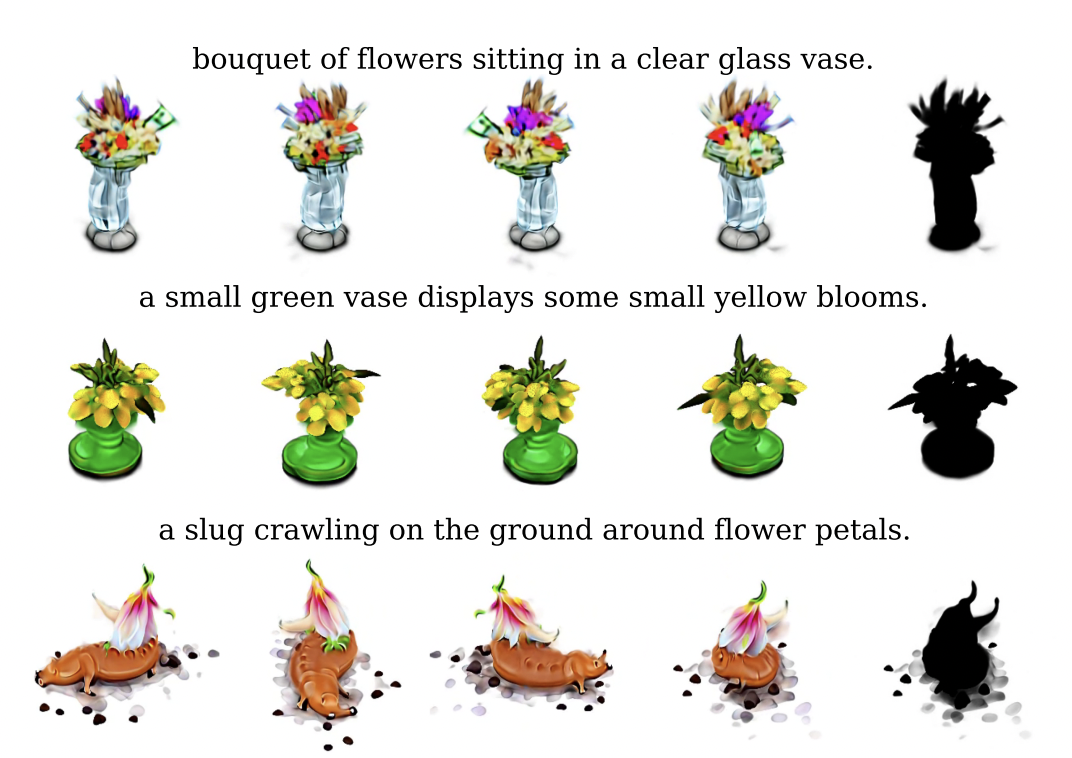DreamFields 结合了神经渲染 (neural rendering) 与多模态图像及文本表征,仅依据文本描述,就可以可以在没有 3D 监督的情况下,生成各种各样 3D 物体的形状和颜色。