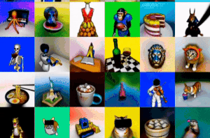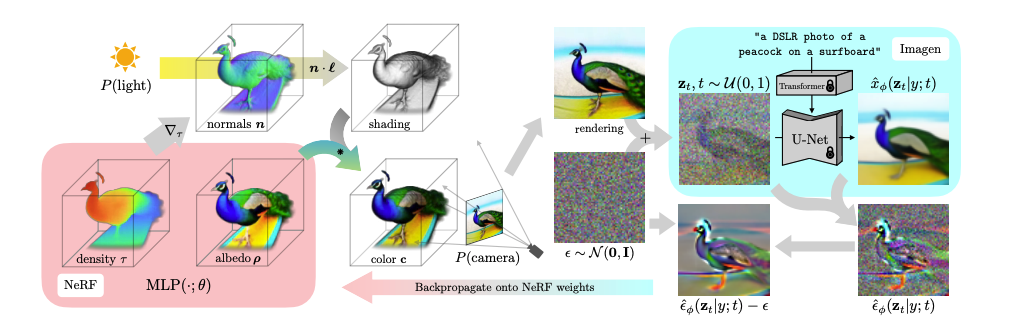 通过在与 DeepDream 类似的程序中应用该 loss,Dreamfusion 优化了一个随机初始化的 3D 模型(一个 Neural Radiance Field 或者 NeRF),通过梯度下降法使其从随机角度的 2D 渲染达到一个相对较低的 loss。