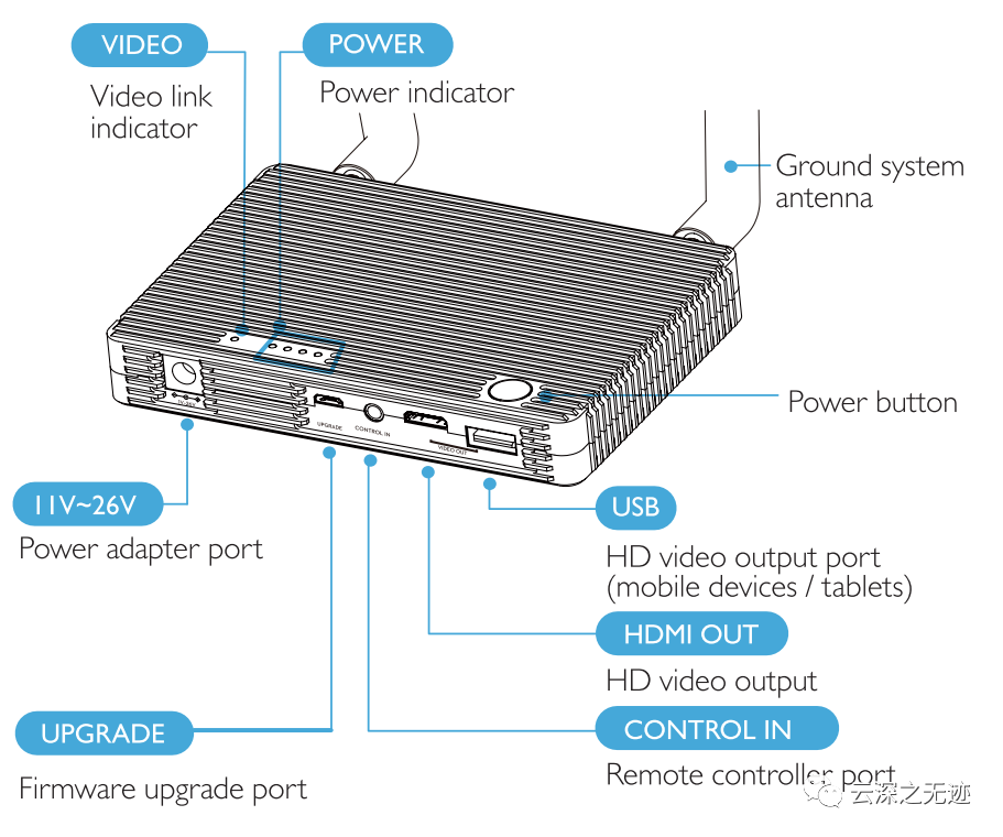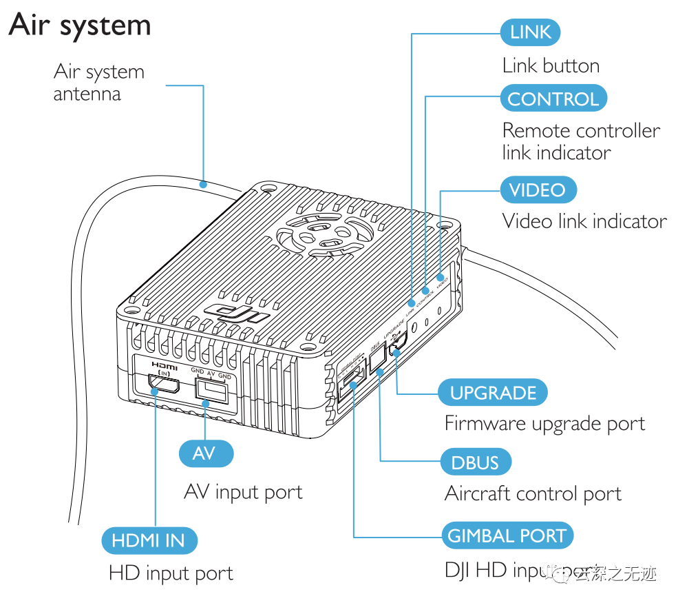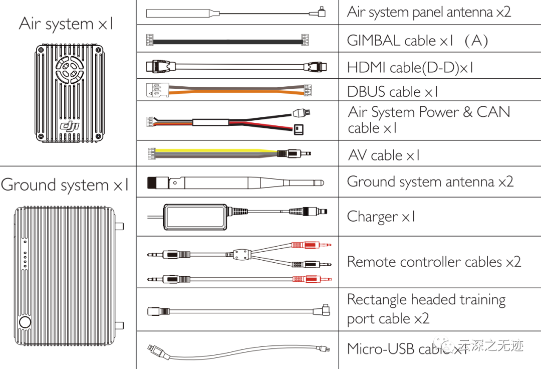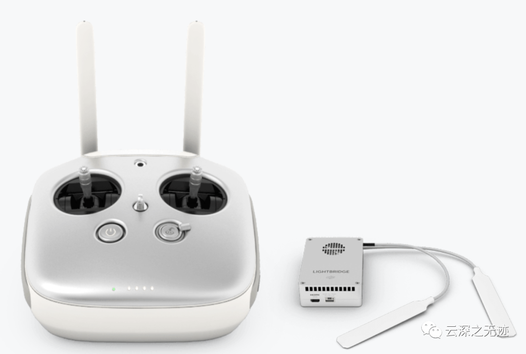 DJI LIGHTBRIDGE(包括机载端和地面端)工作在 2.4GHz 频段,利用无线通信方式传送视频图像、飞控系统 OSD 信息和遥控器信号。