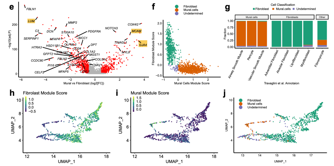 本文也是使用了大量笔墨描述如何区分 mural cells (MCAM and RGS5), mural cells and myofibroblasts (ACTA2) and fibroblasts (DPT), 还是蛮容易区分的 mural cells (n = 69) and fibroblasts (n = 885) :