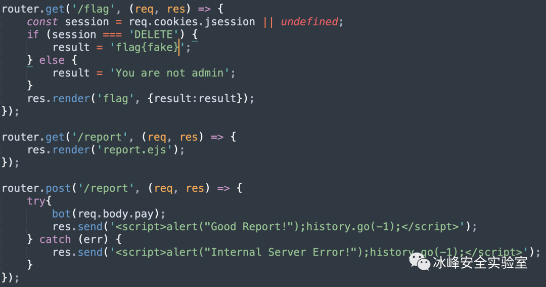典型的XSS题目,题目只提供部分源码,我习惯于先看一下bot代码确定flag位置。这类型题目的考点大概分为两大类,一类要求你伪造cookies作为admin访问对应路由,另一类则直接获取cookies flag在cookies里面。