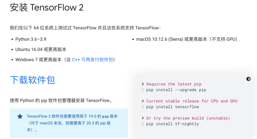 which python3alias python="/Library/Frameworks/Python.framework/Versions/3.10/bin/python3"source .bash_profilecurl https://bootstrap.pypa.io/get-pip.py | python3官网安装指导:https://www.tensorflow.org/install?hl=zh-cn