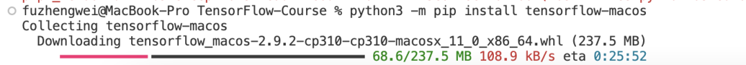 source .bash_profile。python3 -m pip install tensorflow-macos —— 安装比较耗时,需要等待。如果失败了就继续执行这条指令。