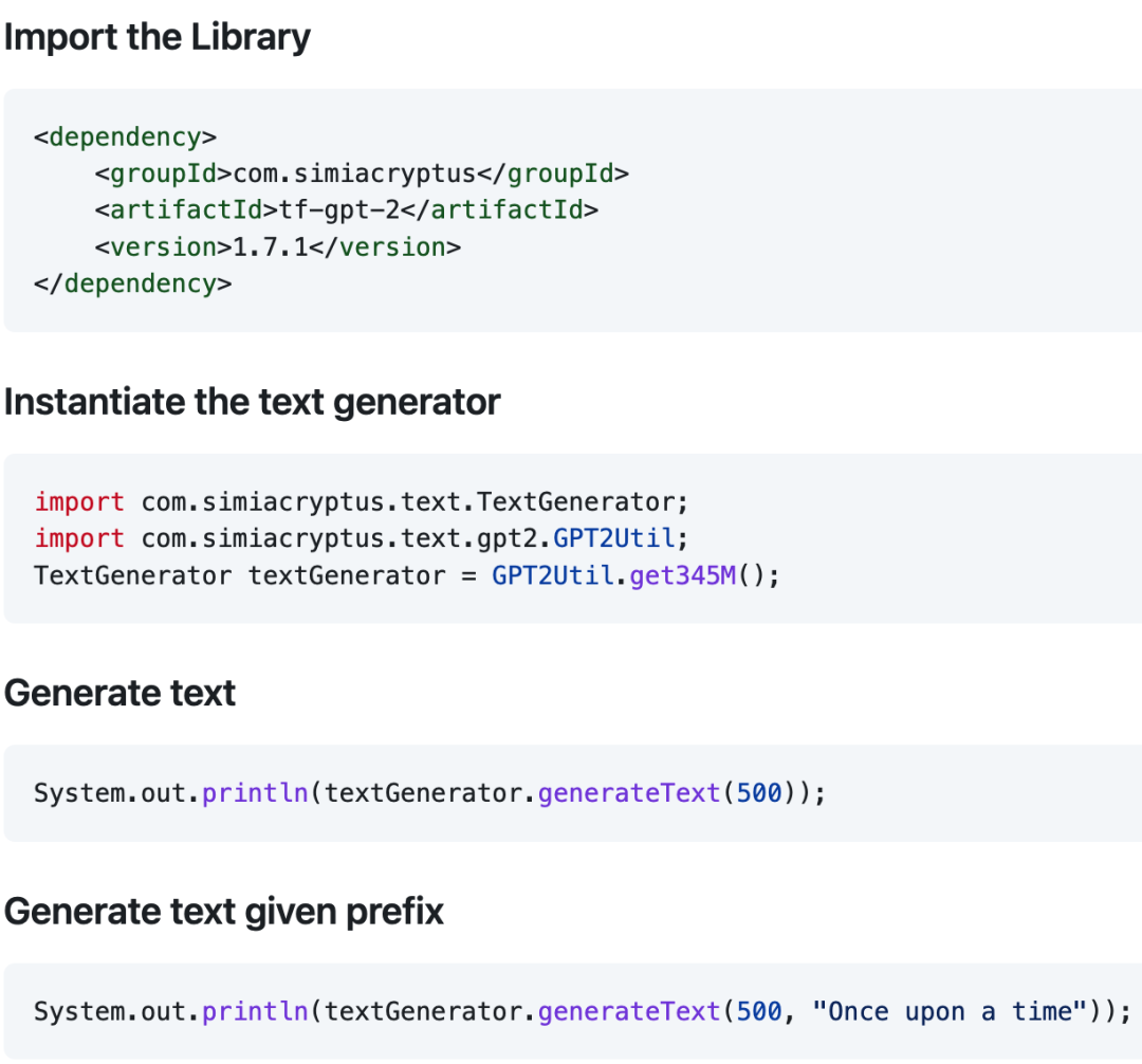 越是检索越是开心,离我的目标也越来越近了。但作为一个量化算法训练的小白,其实我还是希望能找到一份 Java 的模型训练代码,这可以让我操作起来更加顺畅。没错,我找到了,也是3年前就有的一份资料;https://github.com/SimiaCryptus/tf-gpt-2 这是一个基于 Tensorflow 的 GPT-2 文本模型的 Java 库。—— 别着急,这个时候我也不知道 Tensorflow 是啥。
