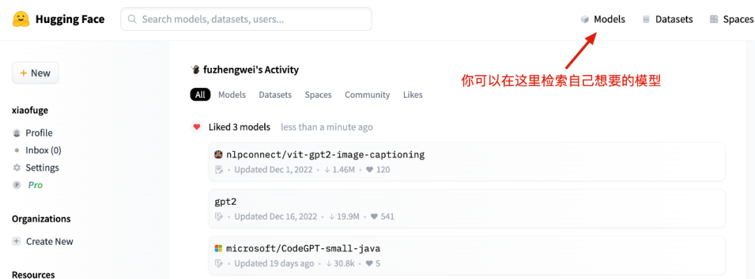 在 Hugging face 社区中可以找到相关的模型训练资源以及提供好的模型使用接口,比如像中文分词、聊天对话、图片分析也都有,当然也包括一些公司训练出来的 gpt-2 模型。