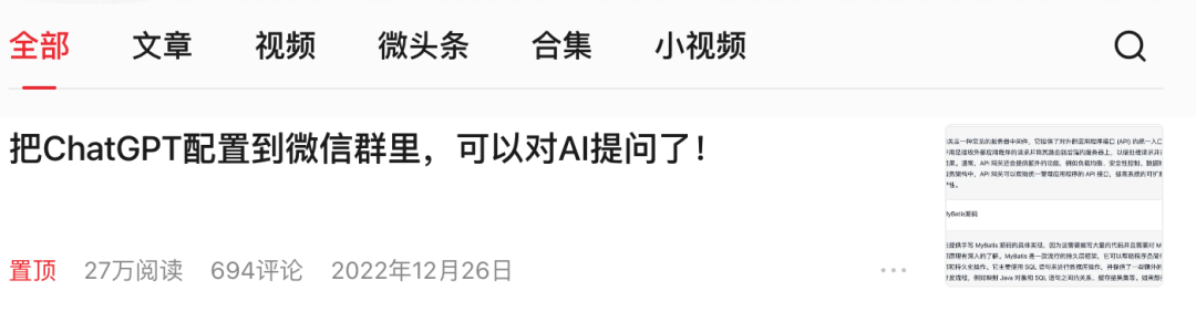 最近 ChatGPT 很火,火到了各行各业。记得去年更多的还是码农最新体验后拿它搜代码,现在各行各业都进来体验,问它咋理财、怎么写报告和给小孩起名。😂 也因此让小傅哥在头条的一篇关于 ChatGPT 的文章都有了26万的阅读。