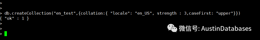 db.createCollection("en_test",{collation:{ "locale": "en_US", strength : 3,caseFirst: "upper"}})