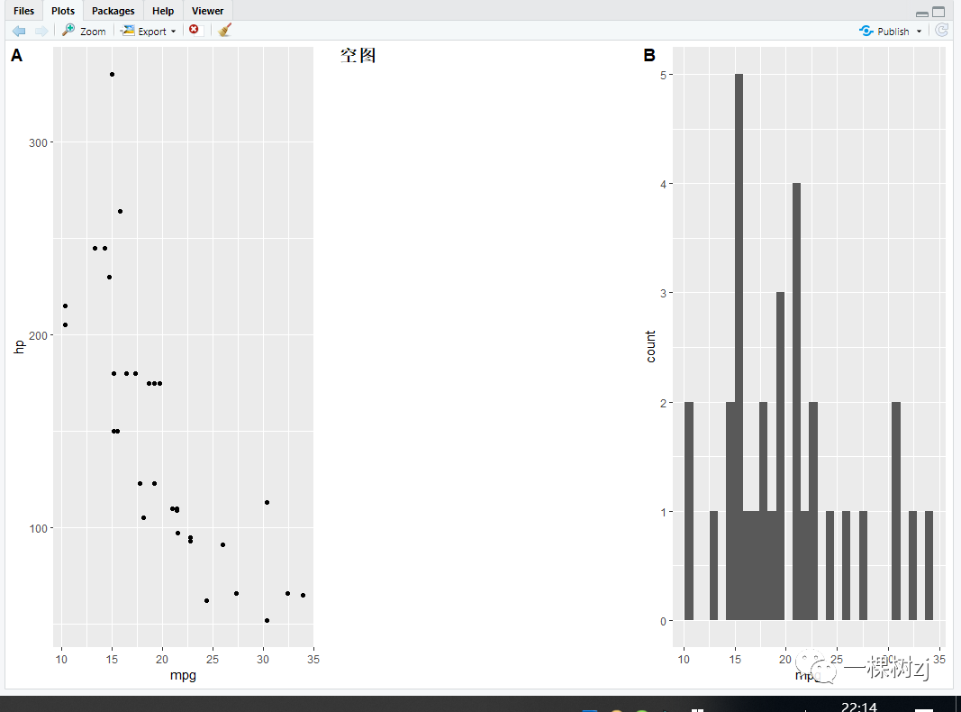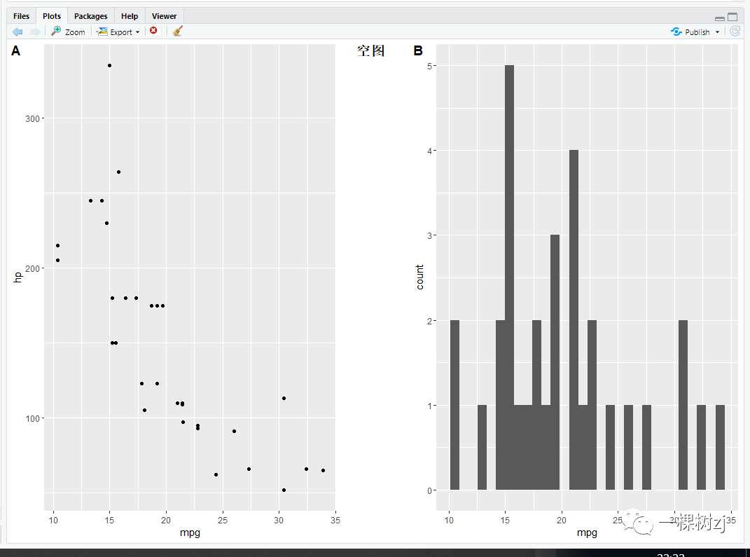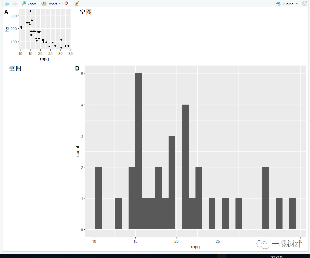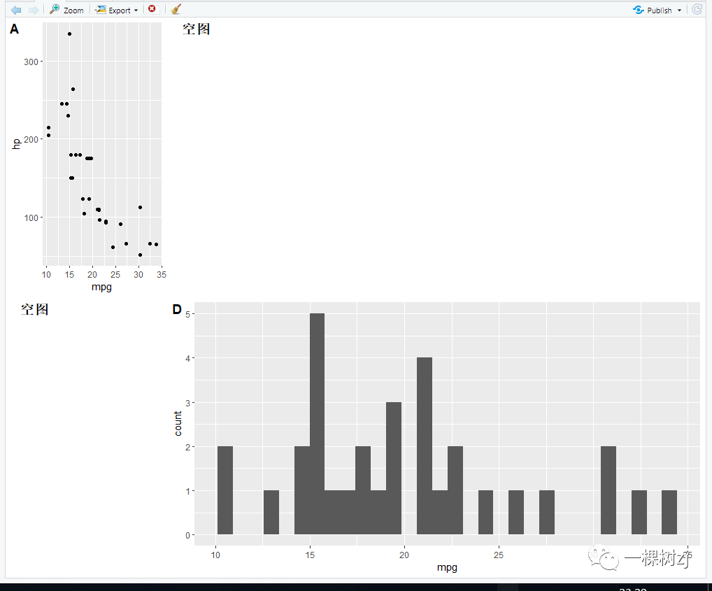 我们看到,A和B之间多了一个空白区域,明显比之前宽多了。这是因为A和B之间多了一个空图(NULL),注意空图也是图啊,所以这幅图是1行×3列的图,有3附图:图A、空图、图B,我们给三个图加上标签