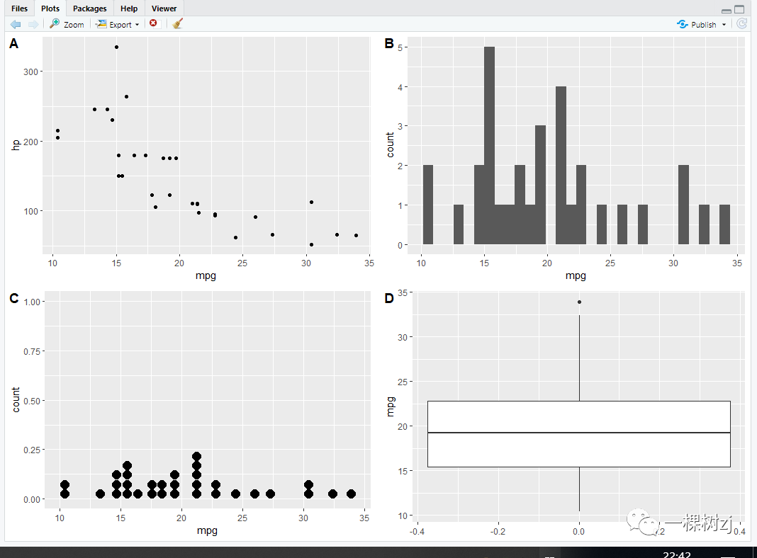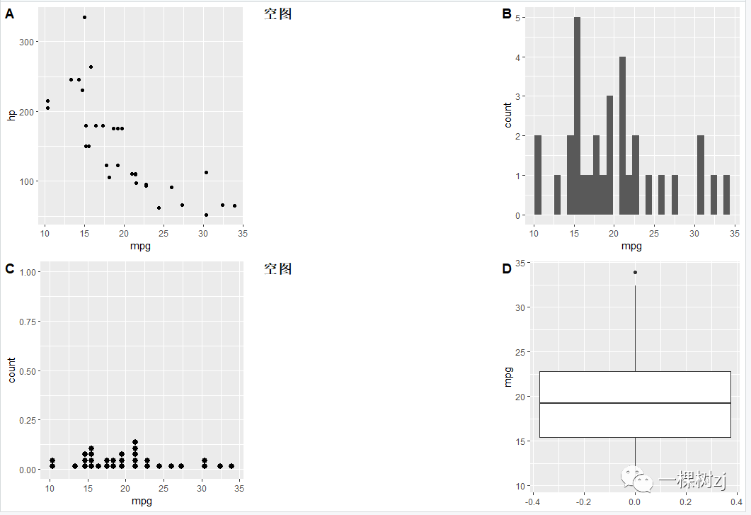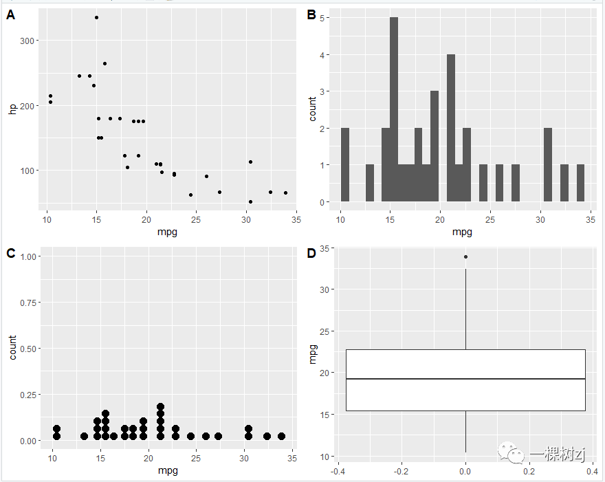 学习这一篇教程的前提是:已经学习了上一篇《R高级|利用cowplot包拼接图片(1)基本操作》,并且熟悉了cowplot包中plot_grid函数的基本操作,我们仍然使用上一篇中的A、B、C、D四幅图在本节中进行演示。