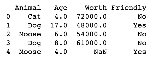 记住,在查看数据集的时候,索引(index)是从 0 开始的。所以,如果希望统计列数,从 0 开始计数而不是 1。「[:, :3]」会返回animal、age和worth三列。其中0表示animal,1表示age,2表示worth。对于这种计数方法,即使你没见过,也会在很短的时间内适应。