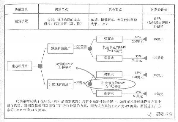 上面的这个计算步骤就是决策树的计算。在做题时,大家一定要记住,每条路径收益花费的汇总,加收益、减花费,最后乘以可能性比率,就是这条路径的 EMV 值。如果有分支路径,将分支路径相加汇总后就成为了上级路径的 EMV 。最后选 EMV 最大的,也就是预期能够带来最大货币价值的那条路径。