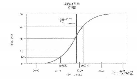 在这里就是使用模型来模拟项目风险和其他不确定性来源的综合影响。需要我们关注的就是通常模拟会使用一个叫做 蒙特卡洛分析 的分析技术。另外,还需要知道下面这个项目总成本累积图也是在定量风险分析中通过模型和模拟获得的。