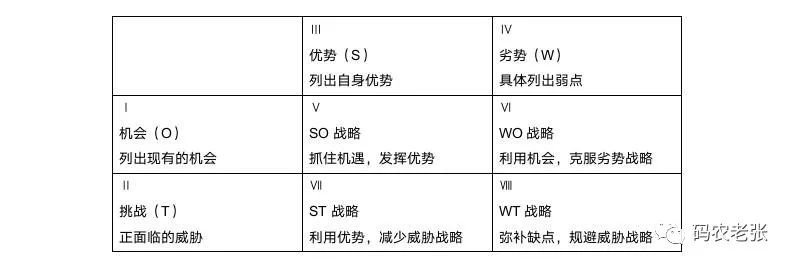 上面这个表格的意思其实就是我们将不同的内容进行合并来寻找突破点。比如说通过合并优势和机会,就形成了 SO 战略,那么我们就要抓住机遇,发挥当前的优势。下面是一个这种 SWOT 分析矩阵的例子。