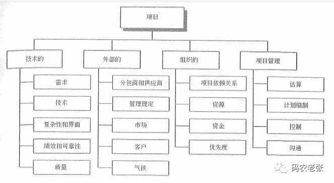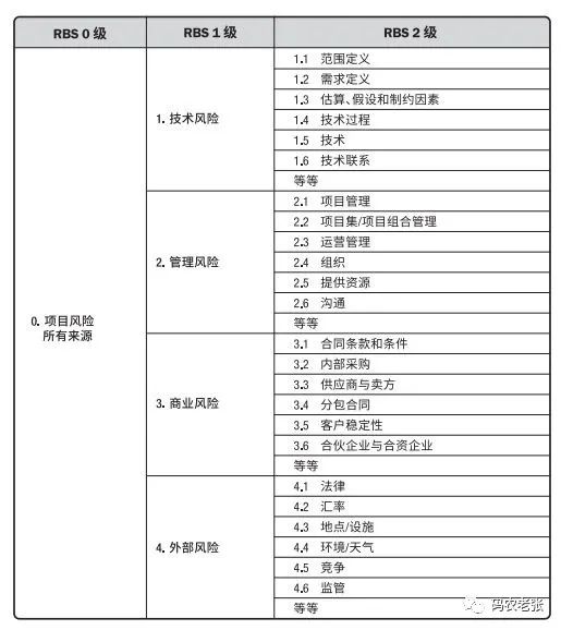 使用这个 RBS 主要就是进行风险的简单分类,类似于组织结构图一样的树形分类方式,可以为确保系统、持续、详细和一致地进行风险识别,并为保证风险识别的效力和质量的风险管理工作提供了一个框架。