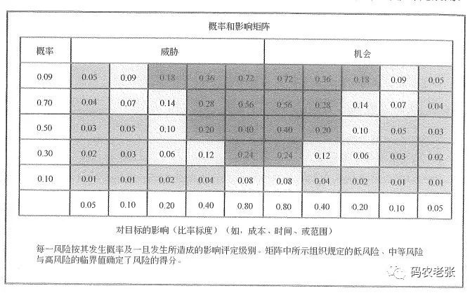 在规划风险的过程中,通用的风险概率水平和影响水平的界定将依据个别项目的具体情况进行调整。我们可以用“非常可能”、“几乎可能”,当然更好的是使用一些常规比例(0.1、0.3、0.5、0.7、0.9)这样数值来衡量风险的影响及概率。