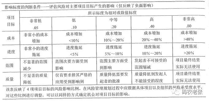 上述内容是通过 范围、进度、成本、质量 四项项目目标的风险影响比例的确定。这只是一个示例,我们需要根据不同的项目情况进行不同的定义分析。