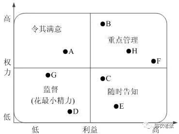 在这四个模型中,最重要的是权利/利益方格,它是以利益为横轴,权利为纵轴所绘制出来的一个坐标图,如下所示。