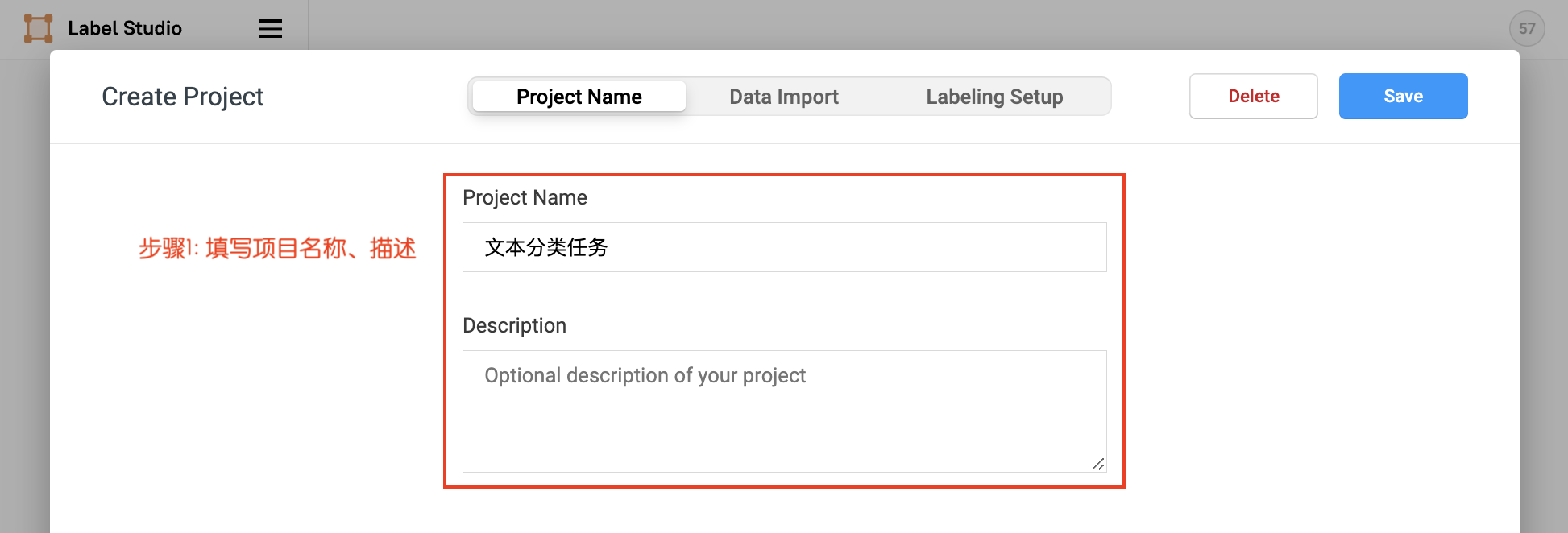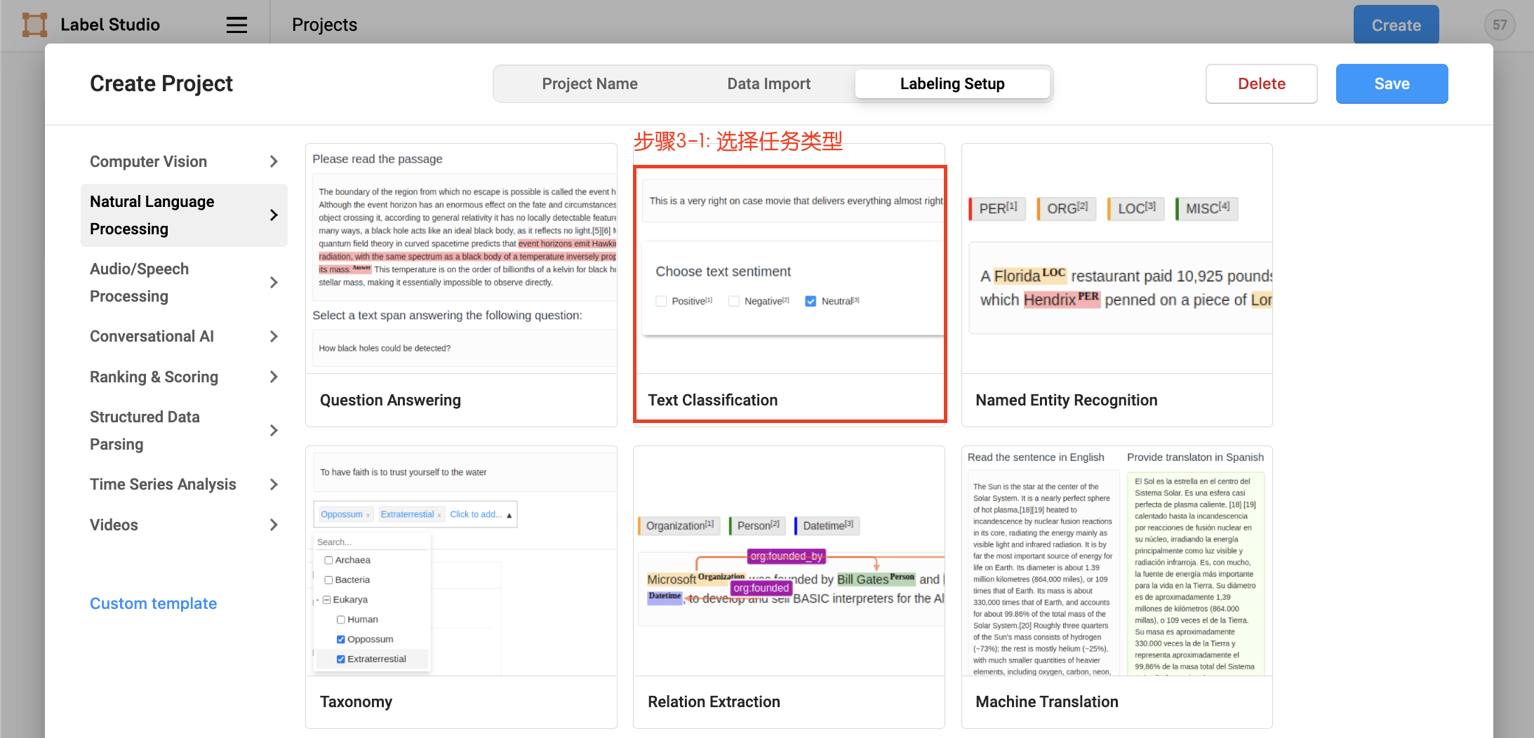 点击创建(Create)开始创建一个新的项目,填写项目名称、描述,然后在Labeling Setup中选择Text Classification。