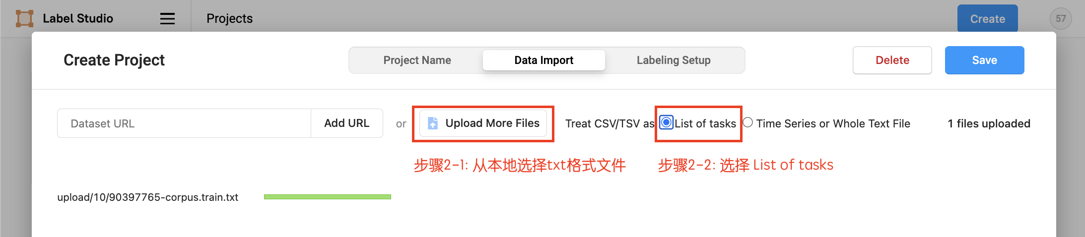 项目创建后,可在Project/文本分类任务中点击Import继续导入数据,同样从本地上传txt格式文件,选择List of tasks,详见项目创建 。