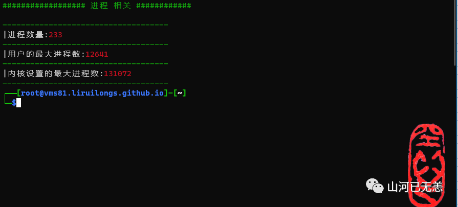 echo -e "|内核设置的最大进程数:\033[31m$pid_max \033[0m"