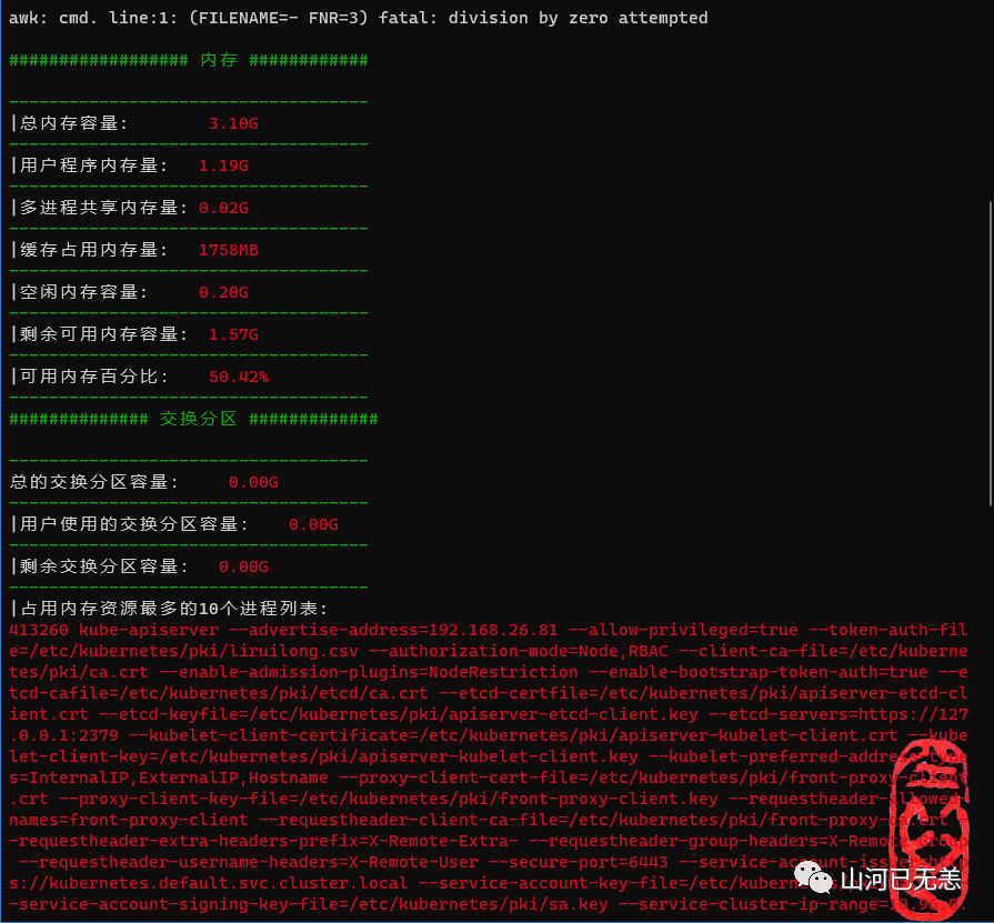 echo -e "|可用交换分区占比:\033[31m $swap_percentage% \033[0m"