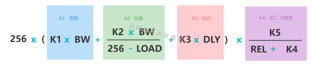 EIGRP度量值计算有点复杂,使用带宽、延迟、负载、可靠性 和 MTU 值来计算的,我们来看一下公式: