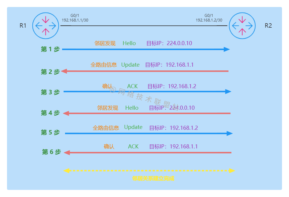邻居发现和拓扑交换比较重要,这里我们用一张图来演示一下步骤,既然讲,那么肯定要讲到位。