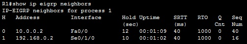 邻居表保存了所有建立EIGRP邻居关系的路由器,EIGRP 邻居表由 Hello 消息建立。