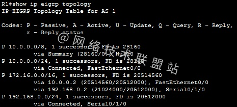 R1 使用包含 R1 的完整 EIGRP 拓扑表的单播更新来响应路由器 R2 的 Hello 消息,此更新消息的目的地是路由器 R2 的 IP 地址 192.168.1.2。