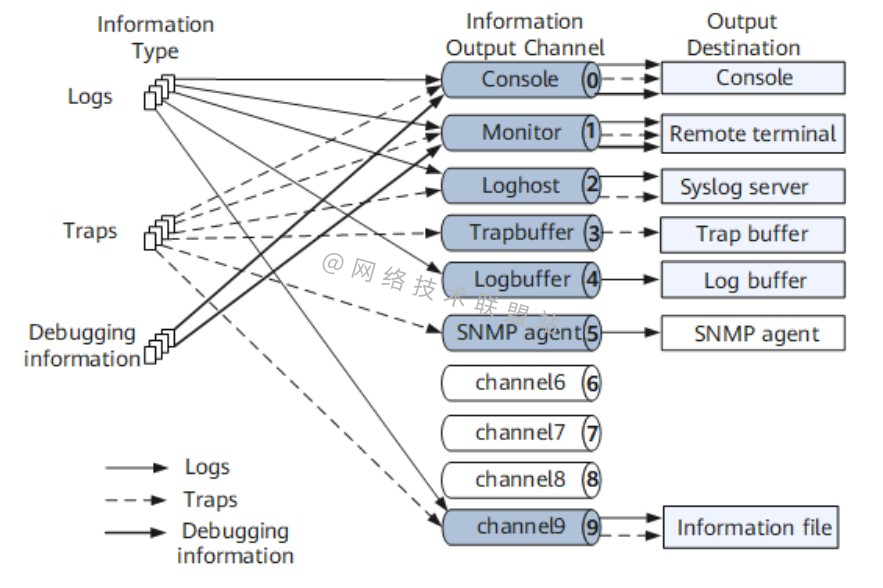对于华为VRP平台,路由器输出的信息主要包括三类信息:日志信息、Trap信息、调试信息。