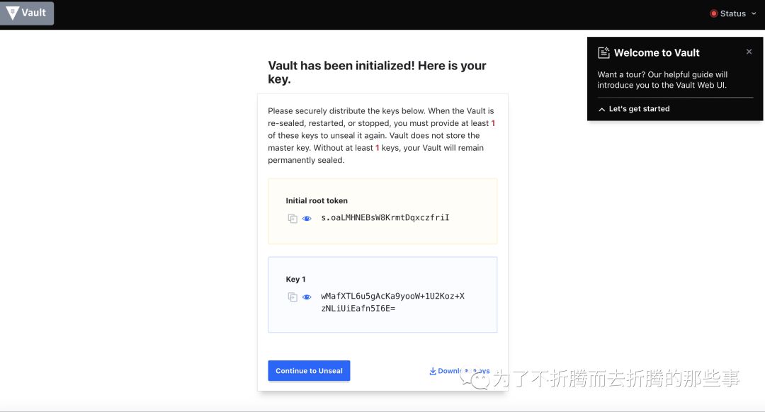 根据上一步的设置,Vault 会给我们提供自动生成的秘钥,分别用于接口验证、系统登录使用。