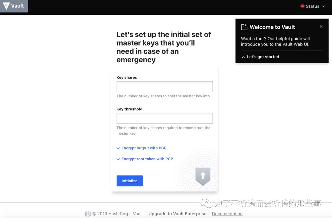 vault_1 | ==> Vault server started! Log data will stream in below:访问我们在 Traefik 中定义的域名:vault.lab.com ,然后会看到下面的界面。
