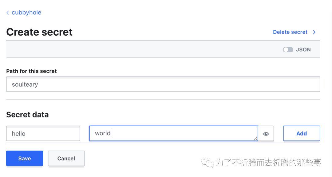 使用上面的秘钥登录系统后,就能够看到登录界面了,系统默认会提供一个 名为 cubbyhole 的“储存仓库”,我们可以在这里添加任意内容,比如: