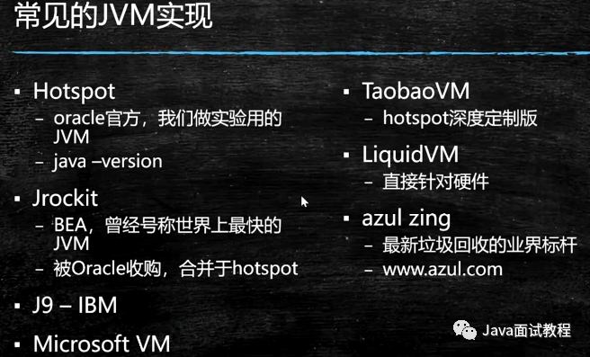 既然JVM是一套规范,必定有很多实现厂商,常见的JVM实现如下: