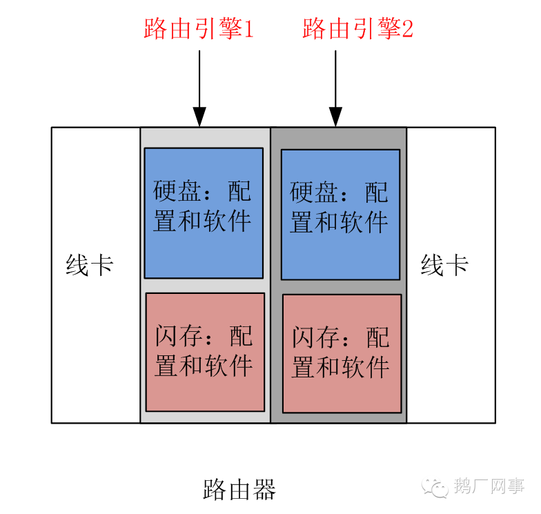 首先来分析设备配置异常。如下是该路由器的一个简单示意图,有一主一备的路由引擎。在主引擎上修改配置时,由主引擎同步给备引擎。10月份重启之前路由引擎1是主引擎;重启之后,路由引擎2是主引擎。
