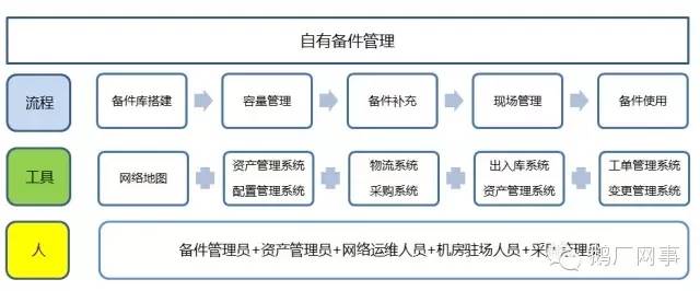 精细化的自有备件管理,需要有相应的流程、工具和人来支撑,我们主要对自有备件管理中的五个子流程进行管控。
