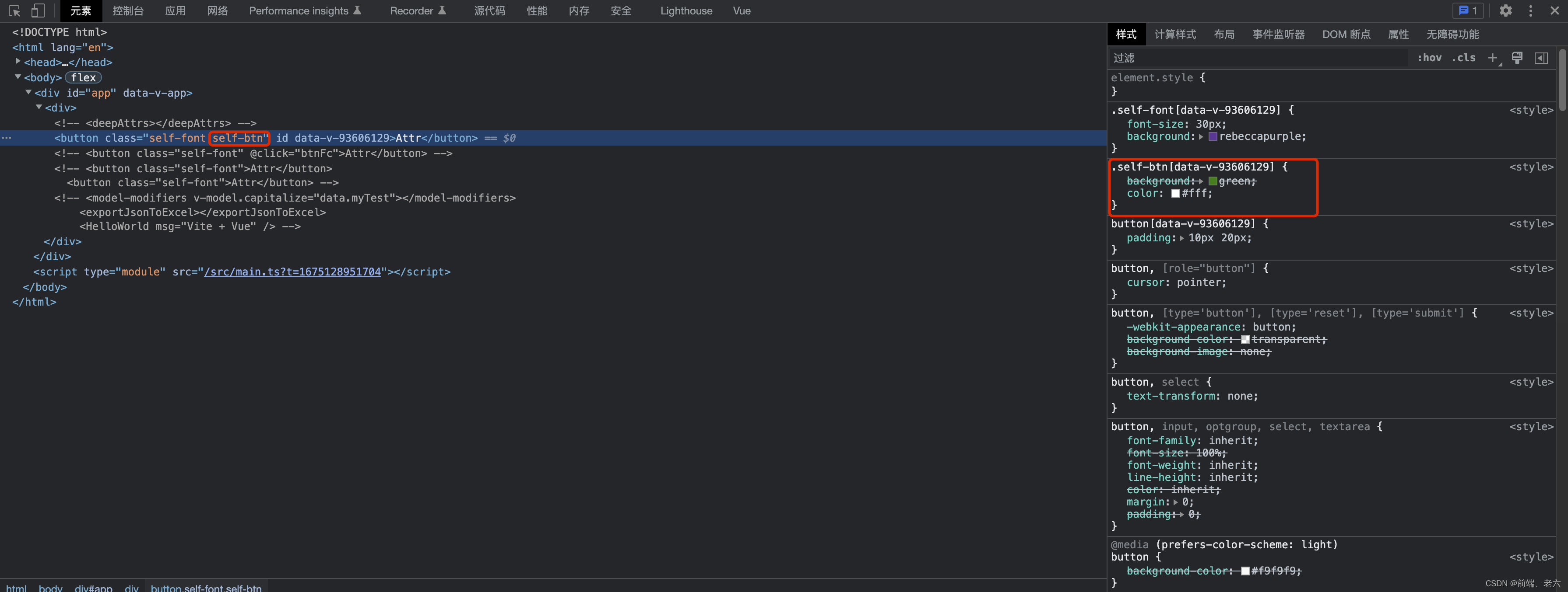 这个时候self-btn的样式并没有传递出去,因为和这个时候他并不知道要传递给哪一个dom元素,同时会曝这样一条警告